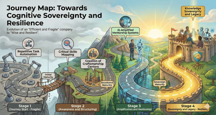 The transition from an “Efficient and Fragile” company to a “Wise and Resilient” organization is not an IT project with a delivery date, but a journey of deep cultural maturity. This path begins at Initial Maturity, where the focus is merely the tactical automation of logical noise, but it must quickly evolve to Structured Maturity, with the rigorous mapping of craft skills that cannot be lost. It is time to create “Craft Centers” where the transmission of knowledge is treated as a governance priority, not an HR operational luxury.